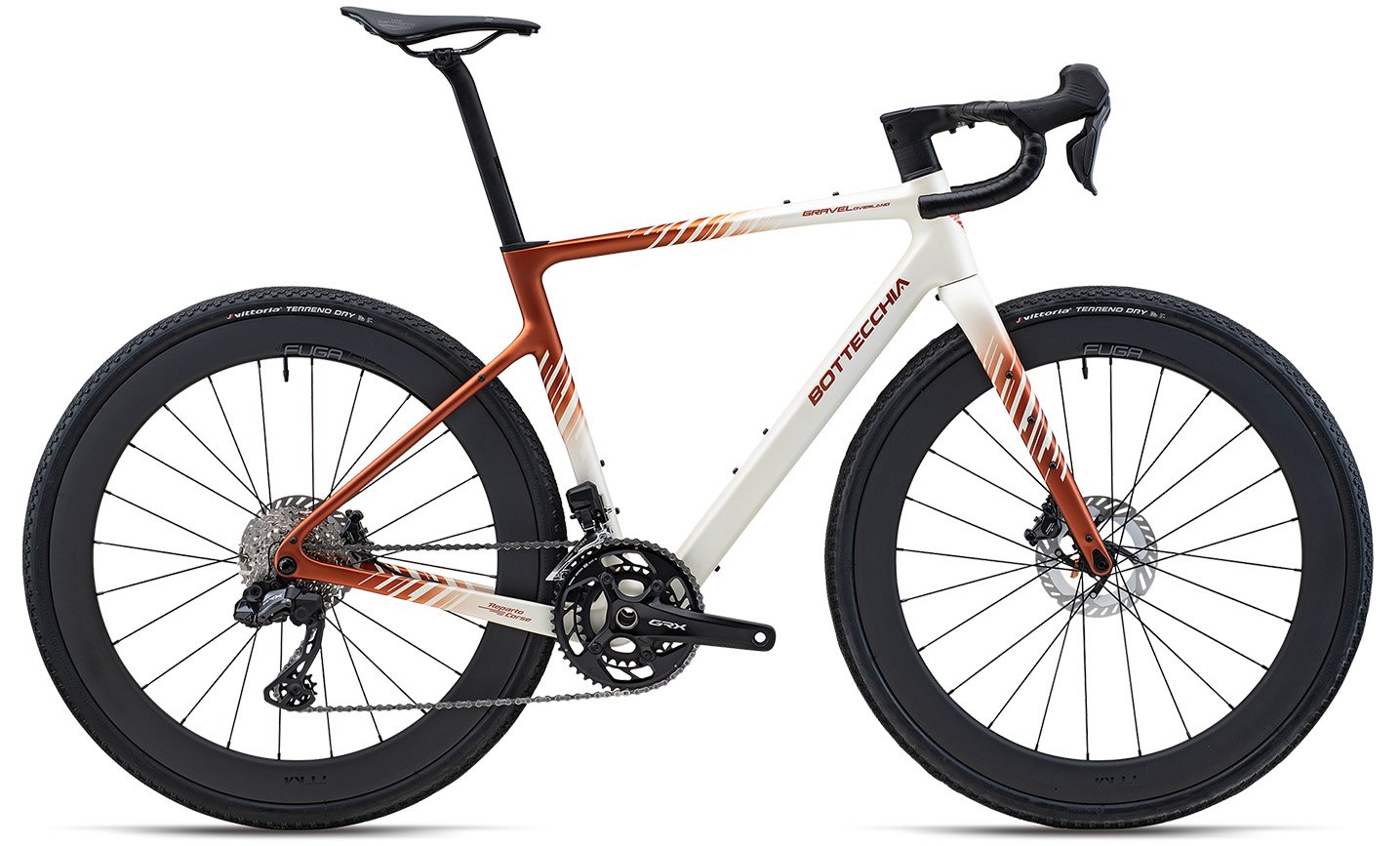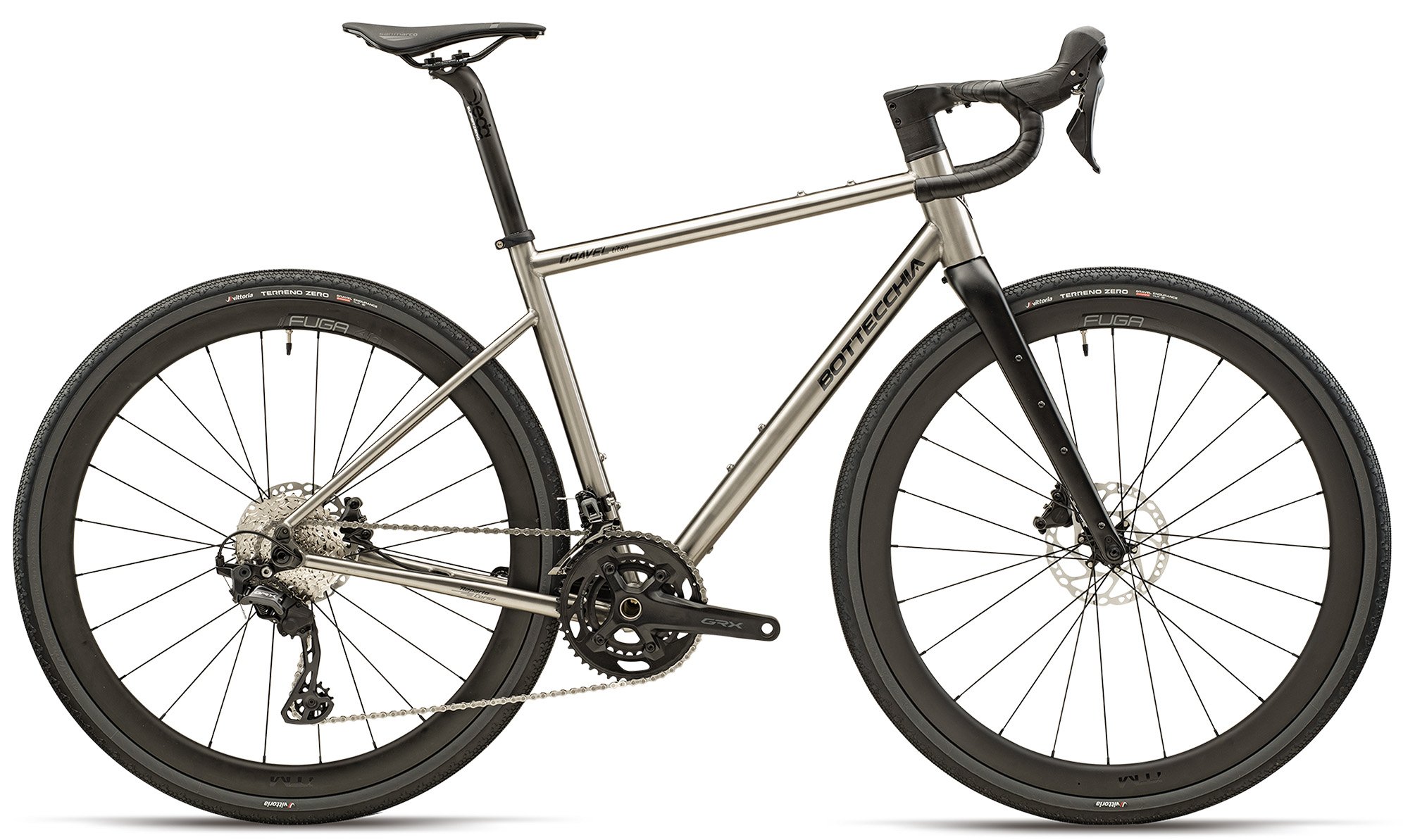 Telaio in Titanio spazzolato, sezione tubi differenziata, passaggio cavi interno. predisposizione per bike paking Forcella in carbonio monoscocca GARANZIA A